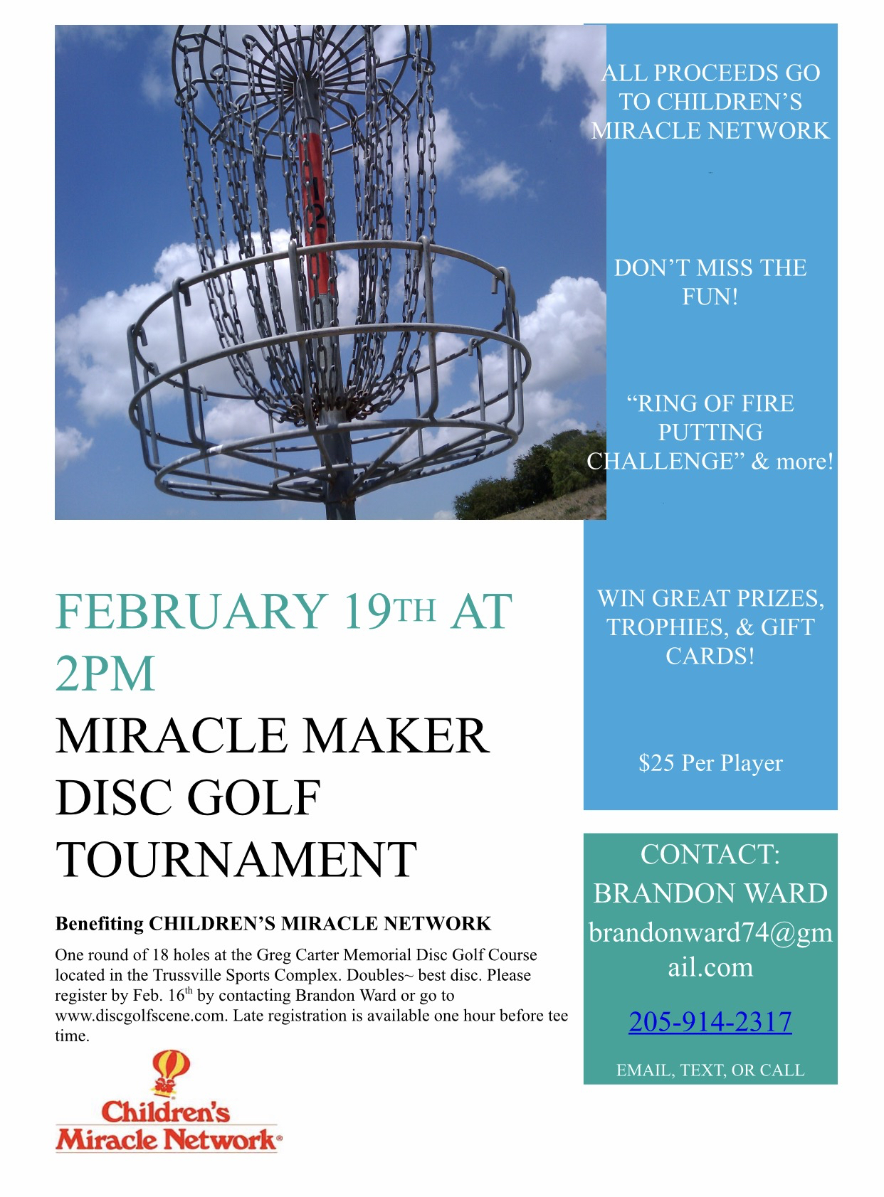 In support of the Community Food Bank of Central Alabama Open Divisions play for 75% cash (25% goes to the Food Bank) Am Divisions are trophy only 1st, 2nd, and 3rd (3 player minimum by January 10th to make a division) First 60 registered Ams receive a players pack with a custom stamped disc and a nested mini set. MULLIGANS!!!! 1 for $3 or 4 for $10! (Maximum to use per round is 2) Save $5 on your registration by committing to bring 5 (or more) canned goods to the tournament for the food bank. Pick-the-pin sponsorships for $20 and Tee sponsors are $35. Double up and get both on one hole for $50! We will also have an awesome raffle with baskets, discs and more!